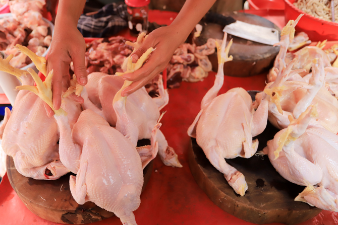 Pedagang menjual ayam potong di Pasar Kebayoran Lama, Jakarta, Senin (7/3/2022). Kenaikan harga daging ayam dari harga Rp.35 ribu menjadi Rp. 38 ribu per kilogram disebabkan permintaan konsumen yang tinggi dan terbatasnya stok ayam pada peternak. Foto: Dery Ridwansah/ JawaPos.com