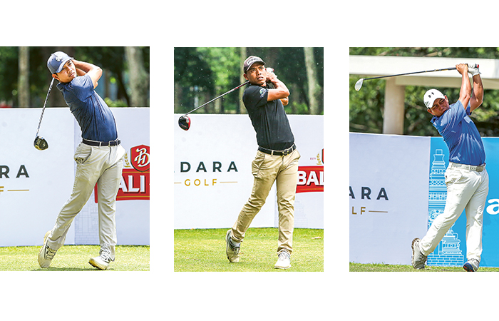 Dari kiri, Kevin Caesario Akbar, Hendri Nasim, dan Sandro Bernad menciptakan pukulan under par hingga merangsek ke posisi lima besar leaderboard seri pertama 75th Jawa Pos Platinum Golf Tournament.