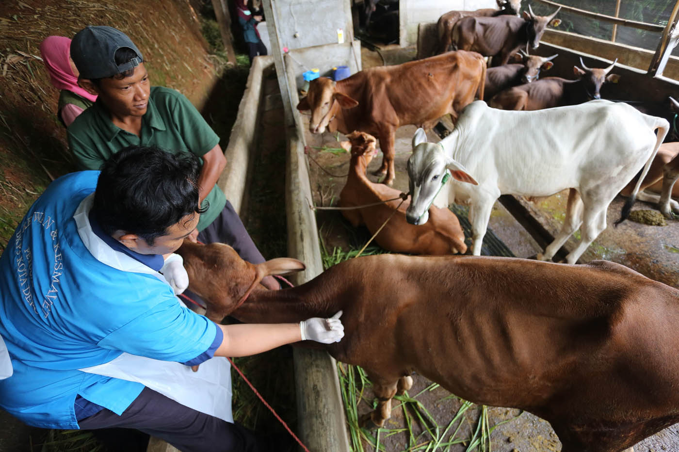 Dokter Hewan Bidang Peternakan dan Kesehatan Hewan menyuntikan vaksin PMK di Kandang sapi warga di Kecamatan Bojongsari Kota Depok Jawa Barat, Selasa (21/1/2024). (Muhamad Ali/Jawa Pos)