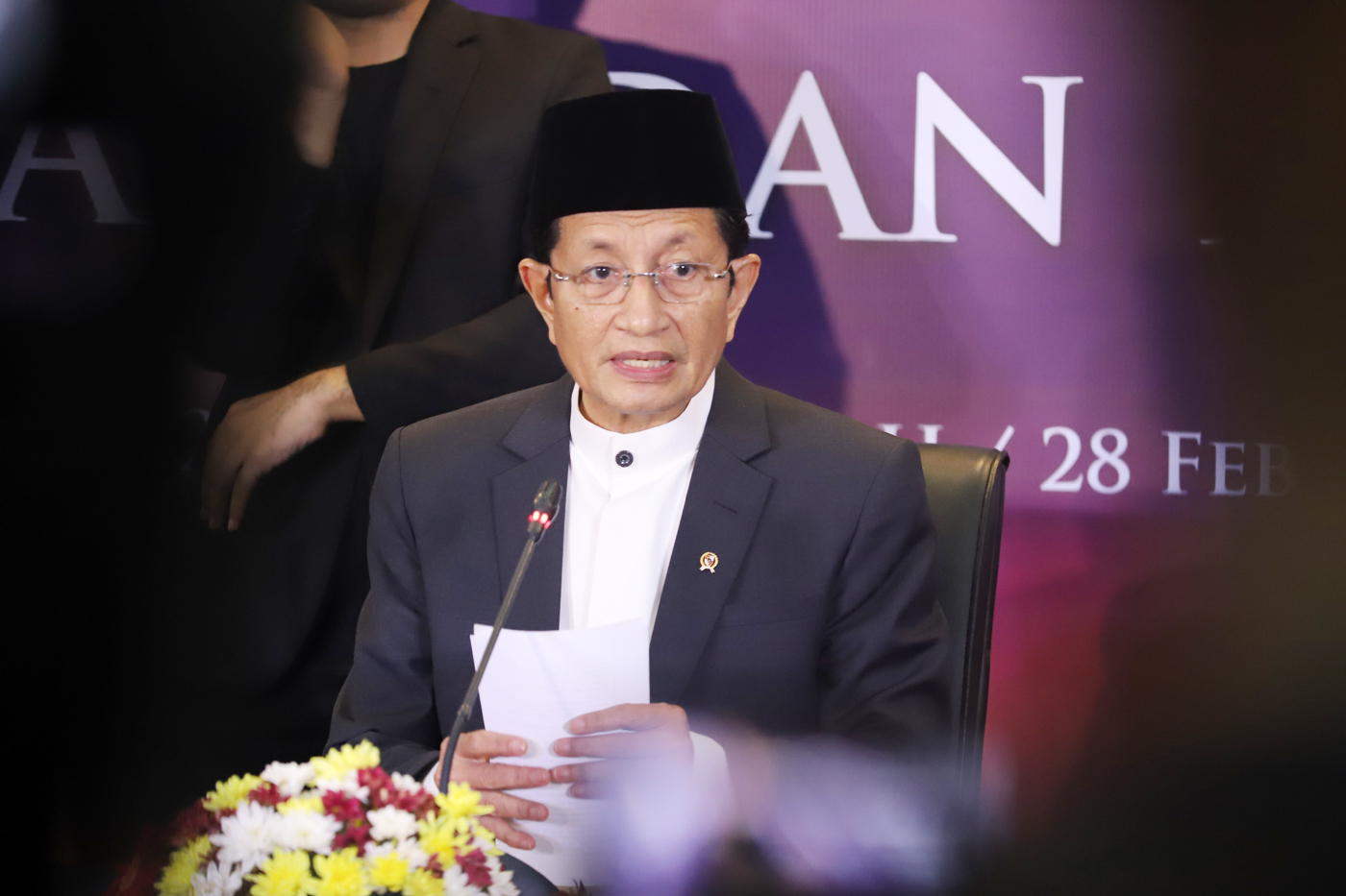 Menteri Agama (Menag) RI Nasaruddin Umar (Tengah) memimpin konferensi pers Sidang Isbat penetapan awal Ramadhan 1446 Hijriyah atau 2025, di kantor Kemenag, MH Thamrin, Jakarta Pusat, Jumat (28/2/2025). (Dery Ridwnasah/ JawaPos.com)
