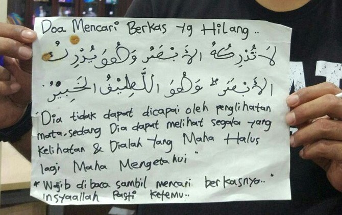 Dari foto yang didapat JawaPos.com, foto itu diberi judul "Doa Mencari Berkas Yg Hilang". Isinya, adalah petikan ayat Alquran, tepatnya surat Al-An'am ayat 103.