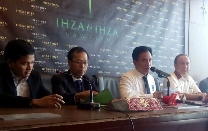 Yusril Ihza Mahendra (dua dari kanan) saat press conference mengenai kasus mobil listrik.