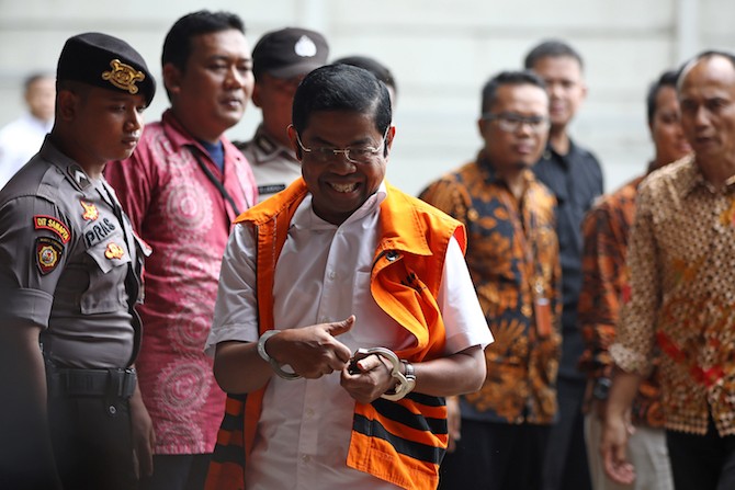 Tahanan Komisi Pemberantasan Korupsi (KPK) Idrus Marham saat akan mencoblos di TPS 012 Guntur, Jakarta, Rabu (17/4/19). Sebanyak 63 tahanan KPK memberikan hak suaranya pada Pemilu 2019. FOTO: HENDRA EKA/JAWA POS