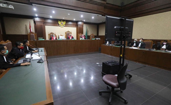 Suasana sidang secara Virtual di Pengadilan Tipikor, Jakarta, Senin (30/3/20). perihal Pencegahan dan Pengendalian Penyebaran Corona Virus Disease 2019 (Covid-19) sidang virtual digelar bagi narapidana tipikor. Sidang secara online ini dilakukan guna menc
