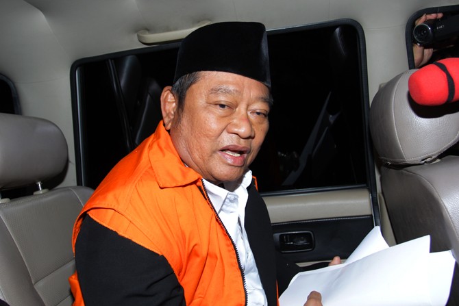 Bupati Sidoarjo Saiful Ilah mengunakan rompi oranye saat berada di mobil tahanan KPK, Jakarta, Kamis (9/1/2019). (Dery Ridwansah/ JawaPos.com)