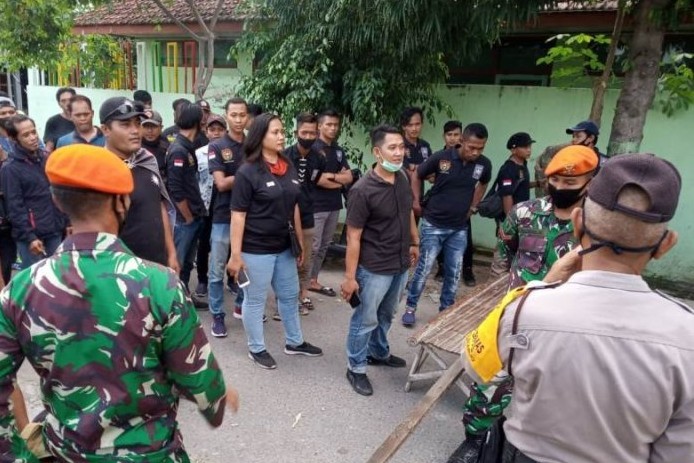 Sejumlah petugas TNI dan Polri mencegah para anggota Persaudaraan Setia Hati Terate (PSHT) yang akan memadati padepokan perguruan di Jalan Merak Kota Madiun pada Kamis (18/6). Louis Rika/Antara