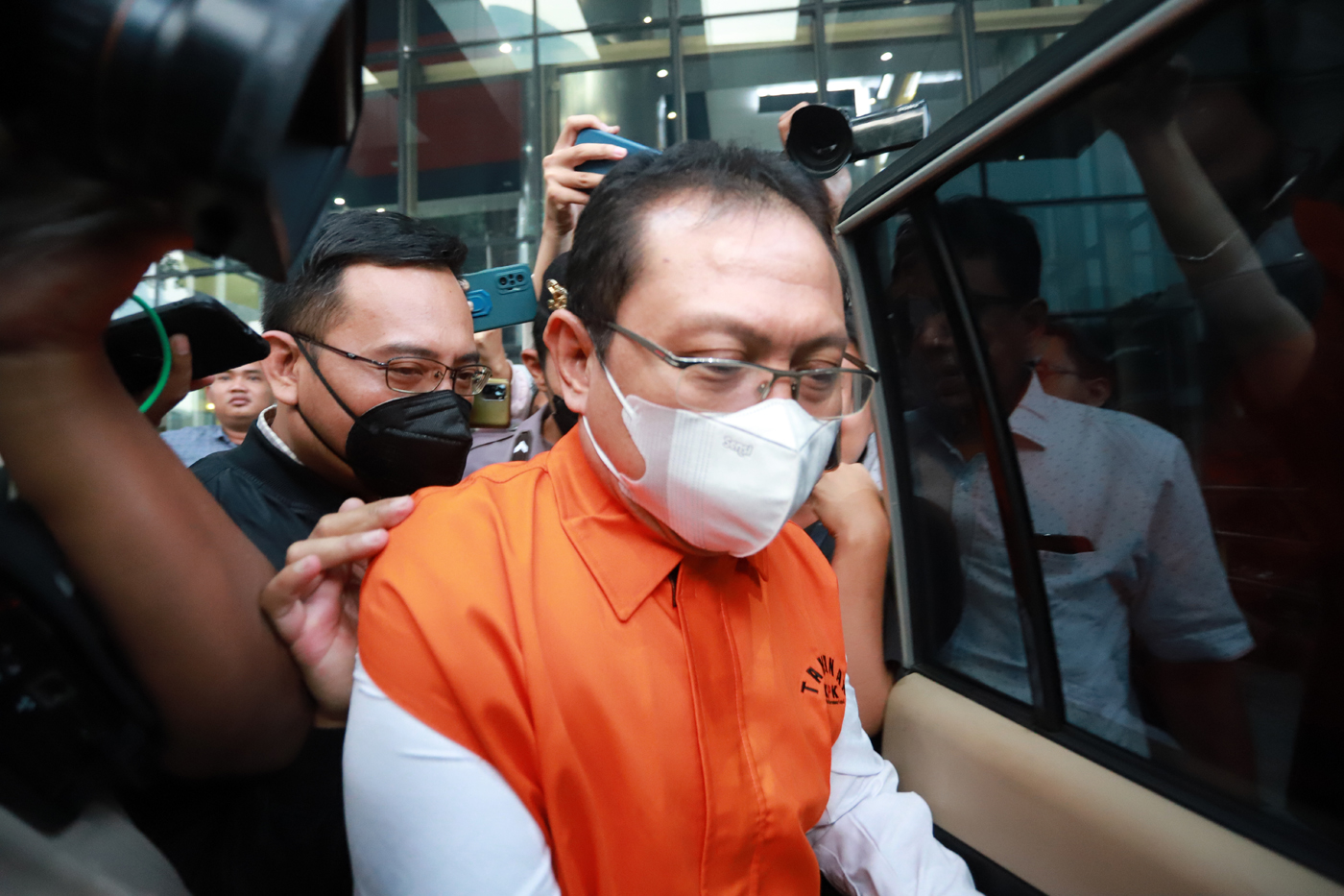 Tersangka Sekretaris MA (Mahkamah Agung) Hasbi Hasan memakai rompi tahanan KPK saat akan mengikuti konferensi KPK di Jakarta, Rabu (12/7/2023). KPK menahan Hasbi Hasan diduga menerima uang Rp 3 Miliar dari debitur Koperasi Simpan Pinjam (KSP) Inti Dana (I