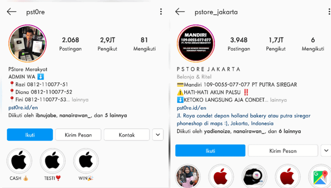 Akun-akun Instagram PS Store yang tampak masih aktif kendati pemiliknya sudah ditetapkan sebagai tersangka berdasarkan pantauan JawaPos.com adalah akun @pst0re yang terlihat memiliki 2,9 juta followers dan @pstore_jakarta dengan 1,7 juta followers.