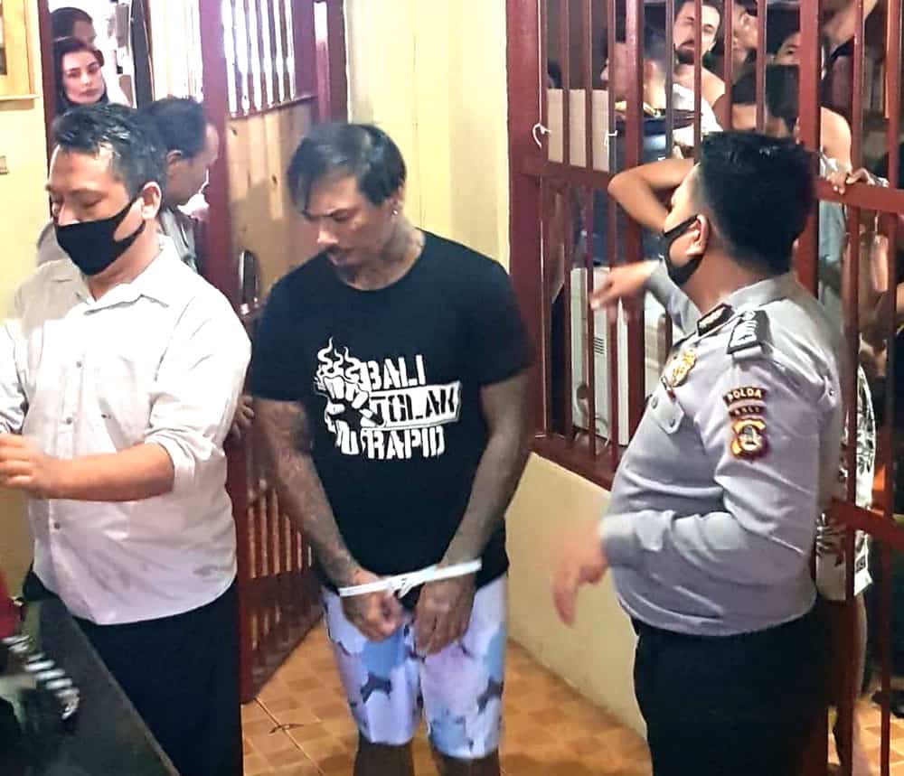 KRITIK BERUJUNG BUI: Dengan tangan terikat, Jerinx digiring menuju sel Mapolda Bali kemarin (12/8). (BALI EXPRERSS)