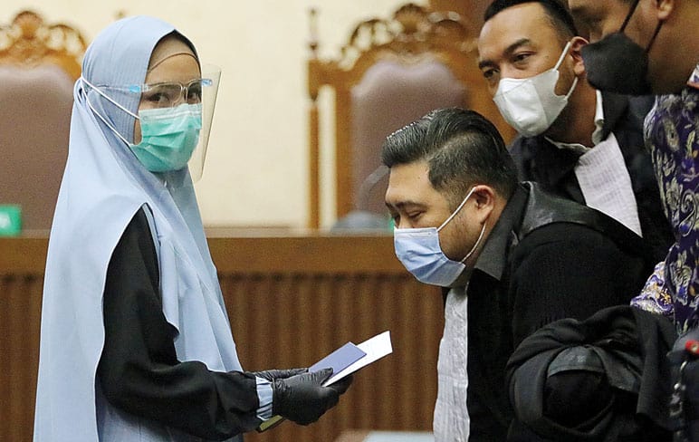 MERASA TAK BERSALAH: Pinangki mengikuti sidang di Pengadilan Tipikor Jakarta, Rabu (30/4). Sidang itu beragenda mendengarkan eksepsi atau nota keberatan atas dakwaan jaksa. (FEDRIK TARIGAN/JAWA POS)