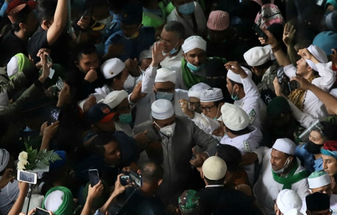 Pemimpin Organisasi Masyarakat (ormas) Front Pembela Islam (FPI) Habib Rizieq Shihab menyapa para pendukungnya saat tiba di Terminal 3, Bandara Soekarno-Hatta, Tangerang, Banten, Selasa (Pemimpin Organisasi Masyarakat (ormas) Front Pembela Islam (FPI) Ha