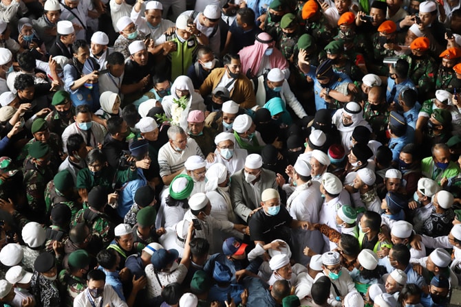 Pemimpin Organisasi Masyarakat (ormas) Front Pembela Islam (FPI) Habib Rizieq Shihab menyapa para pendukungnya saat tiba di Terminal 3, Bandara Soekarno-Hatta, Tangerang, Banten, Selasa (Pemimpin Organisasi Masyarakat (ormas) Front Pembela Islam (FPI) Ha