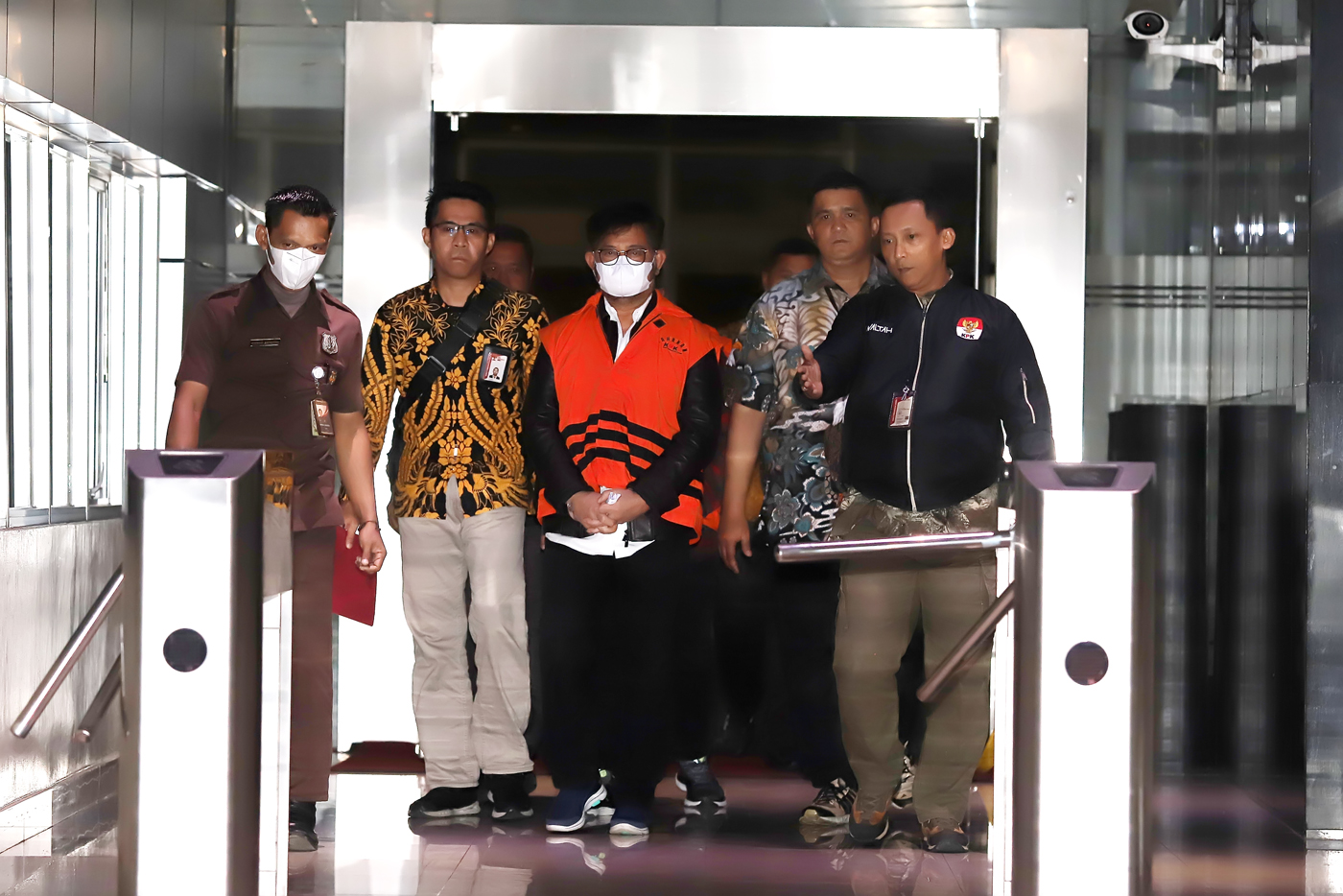 Mantan Menteri Pertanian Syahrul Yasin Limpo mengenakan rompi tahanan KPK usai konferensi pers penahanan dirinya di Gedung Merah Putih KPK, Jakarta, Jumat (13/10/2023).