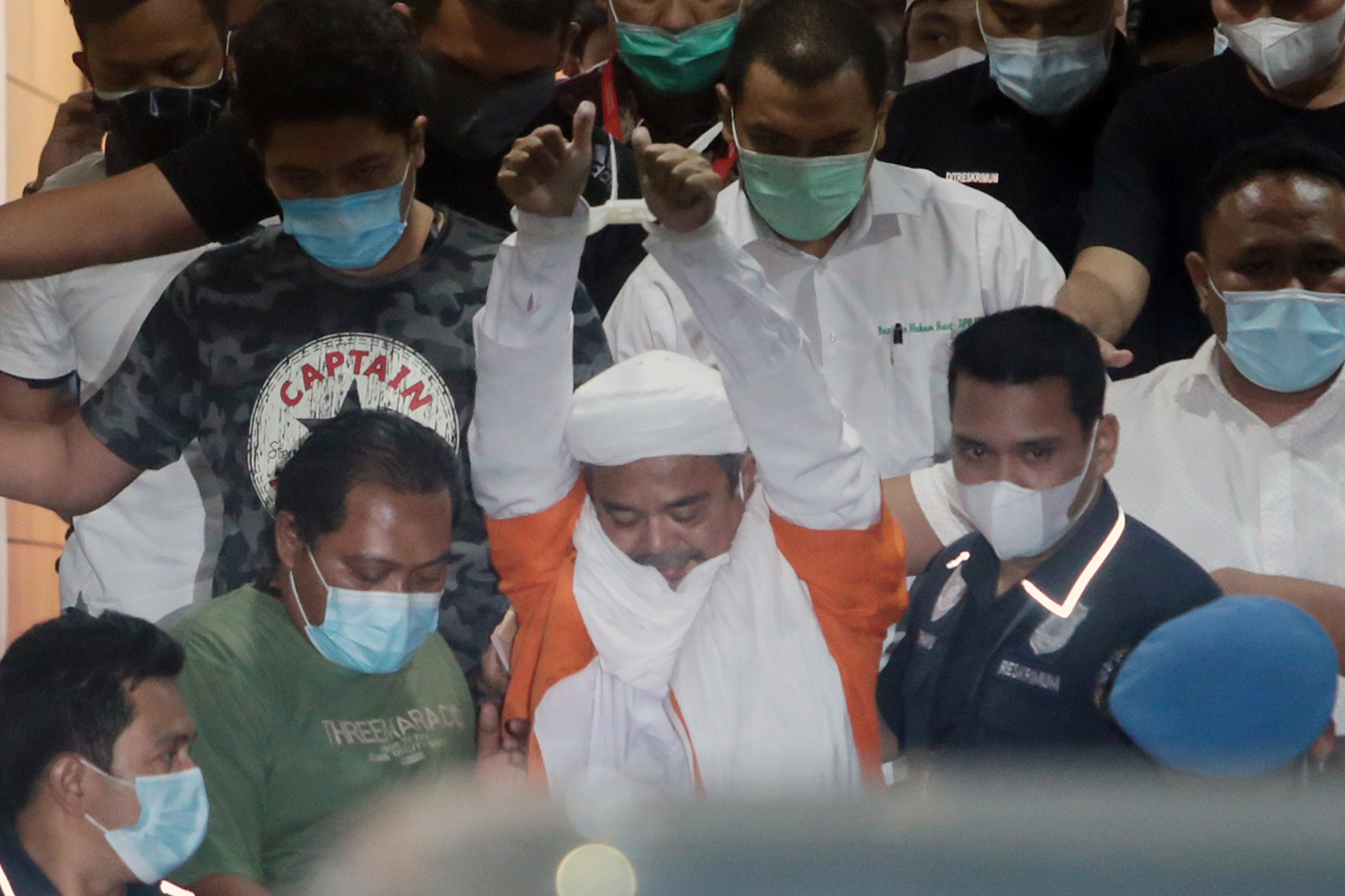Pemimpin Front Pembela Islam, Muhammad Rizieq Shihab menggunakan baju tahanan usai di periksa selama 14 jam sebagai tersangaka kasus penghasutan kerumanan di Direskrimum Polda Metro Jaya, Jakarta, Minggu (13/12/2020) dini hari. Rizieq Sihab resmi ditahan