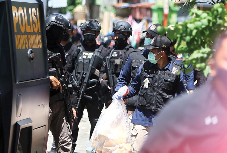 AMANKAN BARANG BUKTI: Tim Densus 88 dan Gegana Brimob Polda Sulsel melakukan penggeledahan di rumah orang tua pelaku bom bunuh diri Gereja Katedral di Jalan Tinumbu, Makassar, Senin (29/3). (TAWAKKAL/FAJAR)