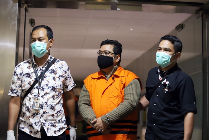 Tersangka dari pihak swasta Ardian IM usai diperiksa di gedung KPK, Jakarta, Minggu (6/12/2020). Ardian ditahan penyidik KPK usai terjaring operasi tangkap tangan perkara dugaan suap pengadaan bantuan sosial dalam penanganan COVID-19 di Kementerian Sosia