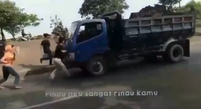 Dalam video yang beredar, terlihat FA dan beberapa temannya berdiri di tengah jalan untuk memberhentikan truk yang melintas.