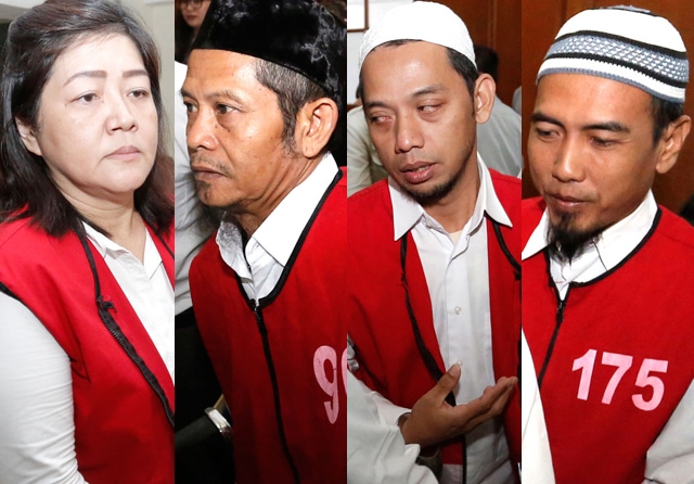 TERPIDANA: Dari kiri, Eksi Anggraini (marketing freelance), Endang Kumoro (mantan Kepala BELM Surabaya I), Misdianto (tenaga administrasi BELM Surabaya I), dan Ahmad Purwanto (general trading manufacturing and senior officer PT Antam) saat menjalani sidan