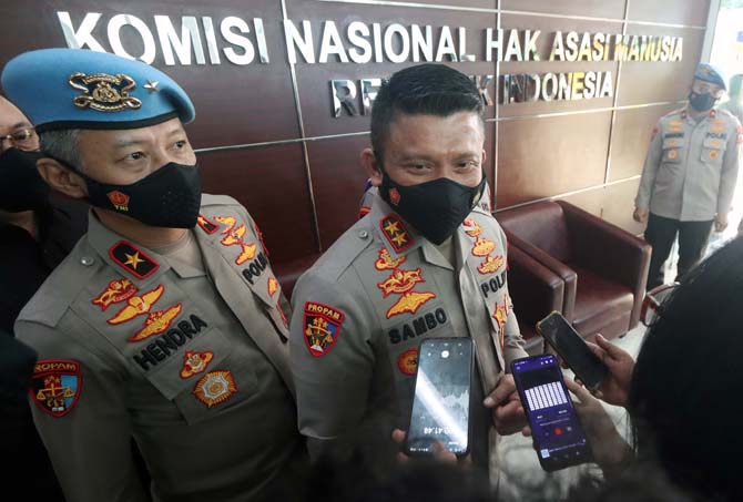 Kepala Divisi Propam, Irjen Pol Ferdy Sambo didapingi Komisioner Komnas HAM bidang pemantauan dan penyelidikan M Choirul saat memberi keterangan kepada awak media usai mengadakan pertemuan di kantor Komnas Ham, Jalan Latuharhary, Menteng, Jakarta Pusat,