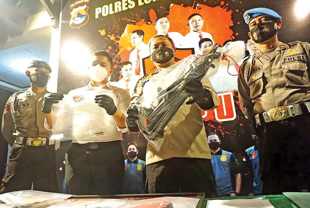 BARANG BUKTI: Kapolres Lotim AKBP Herman Suryono memperlihatkan senjata organik Sabhara laras panjang jenis V2yang digunakan Bripka MN, pelaku penembakan, di Mapolres Lotim Senin (25/10) malam. (LOMBOK POST)