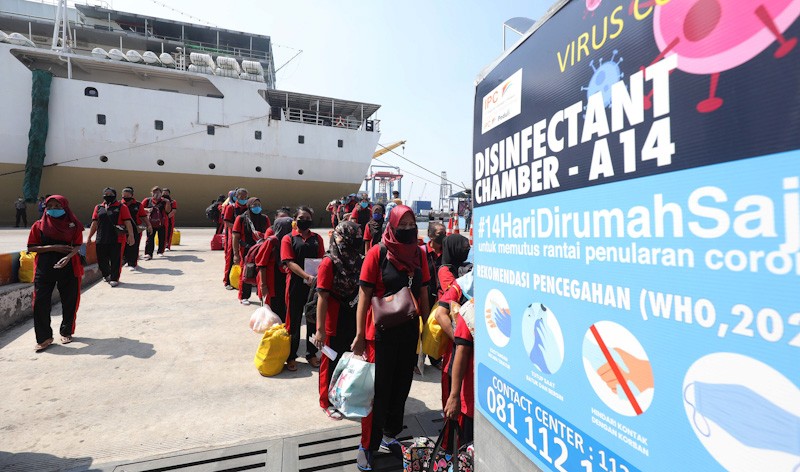 436 orang TKI Ileggal asal Malaysia tiba di Pelabuhan Tanjung Priok, Jakarta Utara, Jumat (12/6/20). TKI Ilegal ini telah menjalani Swab di Tanjung Pinang dan akan dipulangkan ke 22 Propinsi. FOTO : FEDRIK TARIGAN/ JAWA POS