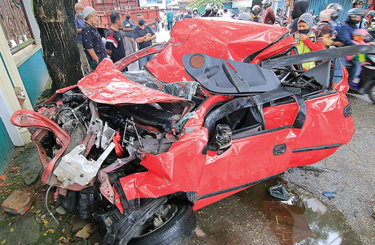TAK BERBENTUK: Kondisi mobil yang dinaiki A bersama orang tuanya. (FUAD MUHAMMAD/KALTIM POST)