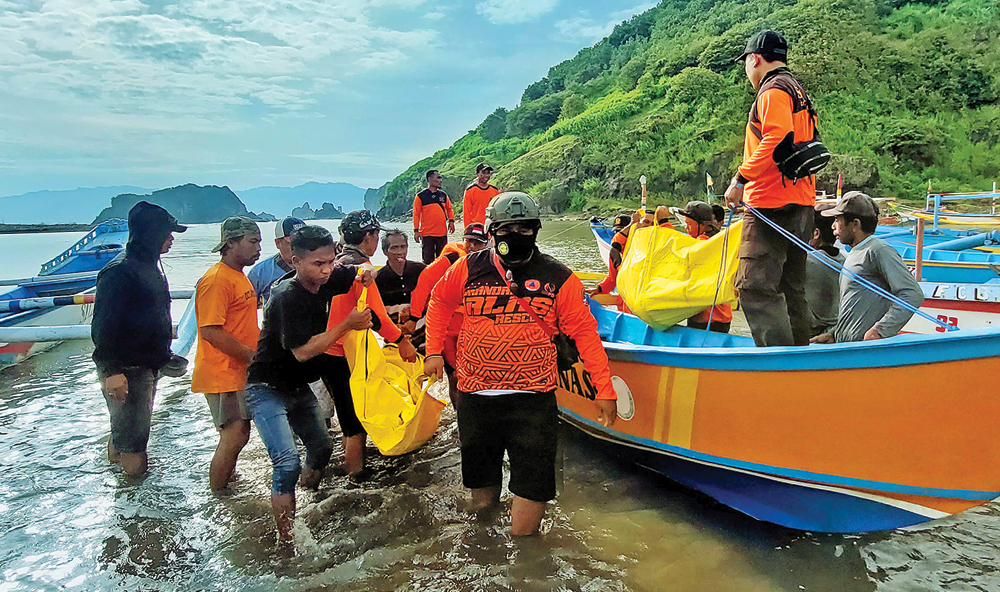 MENINGGAL DI LAUT: Tim SAR mengevakuasi sejumlah jenazah korban dalam tragedi ritual Kelompok Tunggal Jati di Nusatanra di Pantai Payangan, Jember, kemarin (13/2). (JAWA POS RADAR JEMBER)