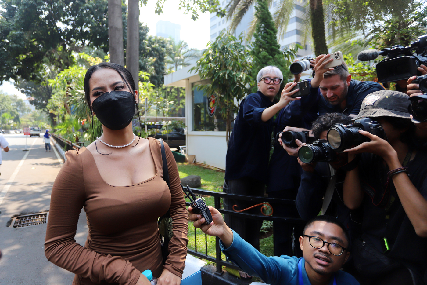 Fransiska Candra Novitasari atau Siskaeee menyapa awak media saat memenuhi panggilan Polda Metro Jaya, Senin (25/9/2023).