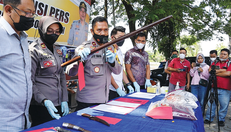 JADI SOROTAN: Wakapolres Loteng Kompol I Ketut Tamiana dalam rilis kasus begal yang malah menetapkan Murtede, sang korban, sebagai tersangka penganiayaan (12/4). (DEDI/LOMBOK POST)
