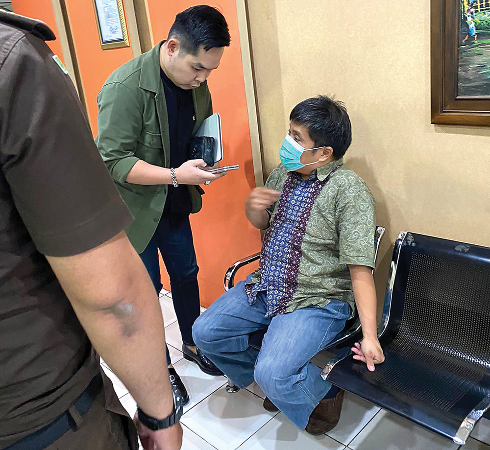 DITANGKAP: Julianto Eka Putra berdiskusi dengan pengacaranya, Jeffy Simatupang, saat dijemput oleh jaksa di rumahnya, kawasan Surabaya Barat kemarin. (KEJATI JATIM)