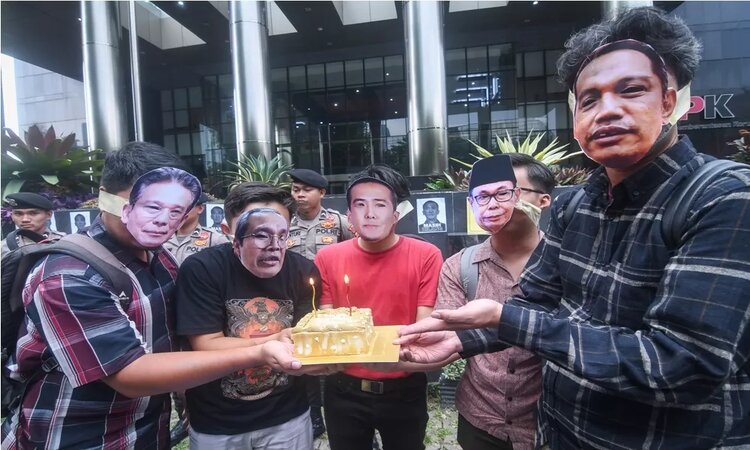 Sejumlah aktivis Indonesia Corruption Watch (ICW) bertopeng buronan Harun Masiku dan empat pimpinan KPK beraksi teaterikal di depan Gedung Merah Putih KPK, Jakarta, Senin (15/1). (ANTARA FOTO)