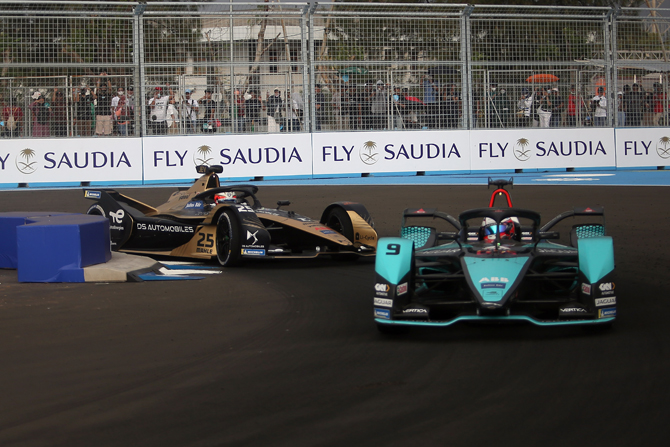 Pembalap melaju usai start pada balapan Formula E seri kesembilan di Jakarta International E-Prix Circuit (JIEC), Jakarta, Sabtu (4/6/2022). HARITSAH ALMUDATSIR/JAWA POS - Image