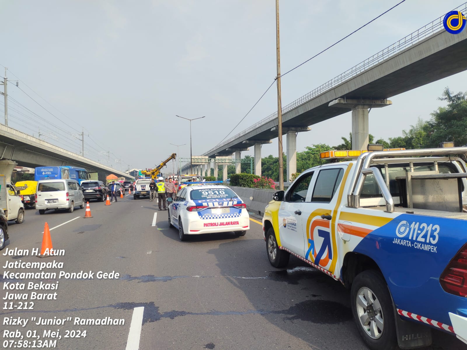 Sejak pukul 08.00 WIB petugas telah selesai melakukan penanganan insiden. Terdapat korban luka ringan dalam kejadian ini dan telah dibawa ke Rumah Sakit Primaya Bekasi Barat. Selanjutnya kejadian ini telah ditangani oleh Petugas Patroli Jalan Raya (PJR) Wilayah Jakarta-Cikampek.