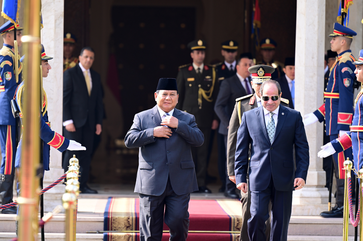 Presiden Republik Indonesia Prabowo Subianto disambut upacara kenegaraan saat tiba di Istana Kepresidenan Al Ittihadiya, Kairo, Mesir, pada Rabu (18/12/2024). (Rusman ? Biro Pers Sekretariat Presiden)