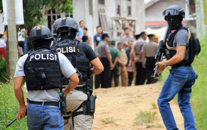Aparat Densus 88 Antiteror saat menangkap terduga teroris di Kampung Bugis, Jambi beberapa waktu lalu.