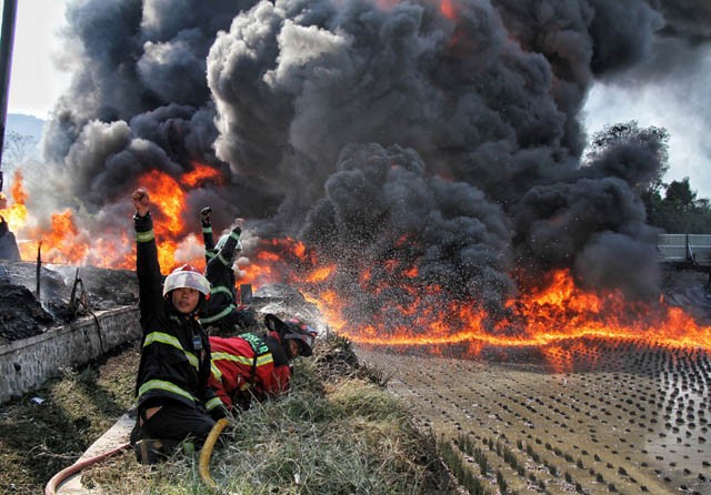Seorang saksi mata menuturkan, sebelum kebakaran, terlihat cairan menyembur. Baru setelah itu api besar muncul, disusul suara ledakan keras. Pemadaman menggunakan cairan AFFF atau aqueous film forming foam yang khusus untuk kobaran api gara-gara minyak.