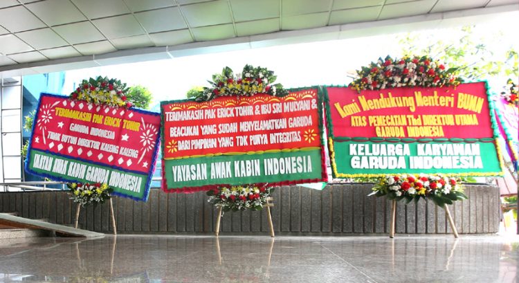 Karangan bunga untuk Menteri BUMN Erick Thohir di halaman Kementerian BUMN Jakarta, Jumat (6/12/2019). Karangan bunga tersebut sebagai bentuk apresiasi publik kepada kementerian yang dipimpin Erick Thohir yang sudah bersikap tegas terhadap Eks Dirut Garuda Indonesia Ary Ashkara. (MIFTAHULHAYAT/JAWA POS)