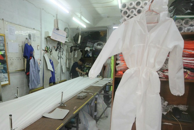 Pekerja membuat pakaian alat perlindungan diri (APD) tenaga medis di Pusat Industri Kecil, Penggilingan, Jakarta, Kamis (26/3/2020). Pakaian APD tersebut dijual Rp45.000 untuk jenis pakaian sekali pakai dan Rp75.000 untuk pakaian yang bisa dicuci. Foto: D
