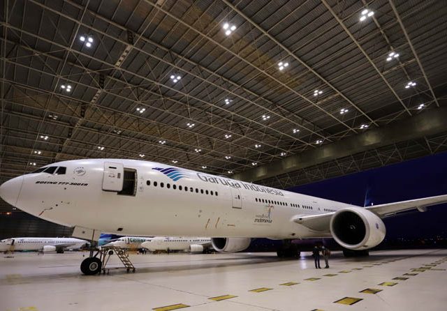 Ilustrasi pesawat Garuda Indonesai di Hanggar GMF Bandara Soekarno-Hatta, Tangerang. (Dery Ridwansah).
