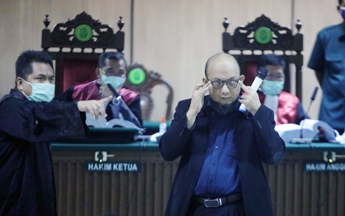SAKSI KORBAN: Novel Baswedan dalam sidang lanjutan kasus penyiraman air keras terhadapnya di PN Jakarta Utara, Kamis (30/4). (FEDRIK TARIGAN/JAWA POS)