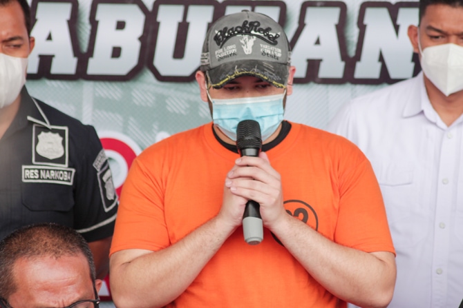 Artis dangdut Ridho Rhoma dihadirkan saat gelar rilis oleh Polres Metro Pelabuhan Tanjung Priok, Senin (8/2/2020). Artis dangdut Ridho Rhoma kembali berurusan dengan kasus narkoba. Ridho Rhoma ditangkap atas penyalahgunaan narkoba berjenis ekstasi. Polisi