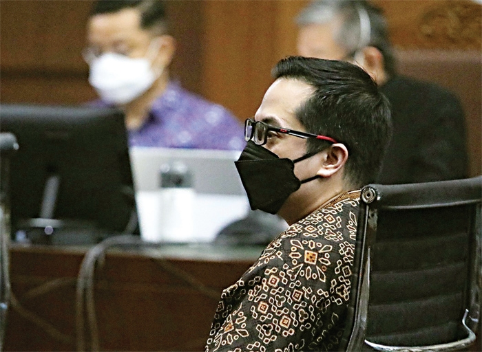 BERI KESAKSIAN: Politikus PDIP Ihsan Yunus menjadi saksi dalam sidang lanjutan kasus dugaan korupsi bansos Covid-19 dengan terdakwa mantan Menteri Sosial Juliari P. Batubara di Pengadilan Tipikor Jakarta kemarin (21/6). (FEDRIK TARIGAN/JAWA POS)