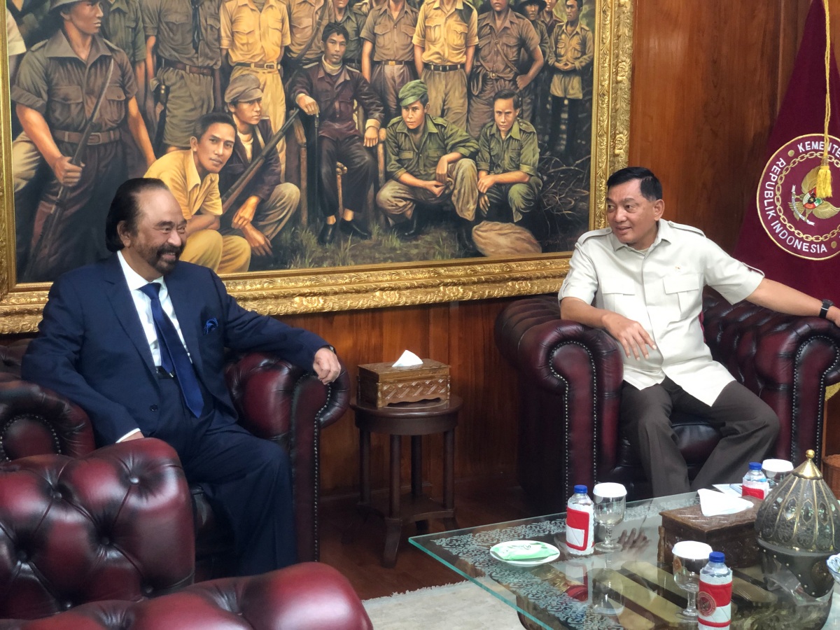 Menhan Sjafrie Sjamsoeddin menyampaikan keterangan bersama Ketum Partai NasDem Surya Paloh usai pertemuan di Kantor Kemhan pada Rabu (15/10). (Syahrul Yunizar/JawaPos.com)