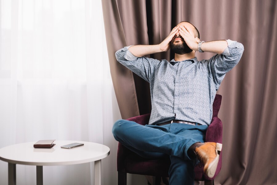 Ilustrasi seorang individu tampak lelah dan lesu setelah berinteraksi, dengan bayangan gelap di sekitarnya./Freepik
