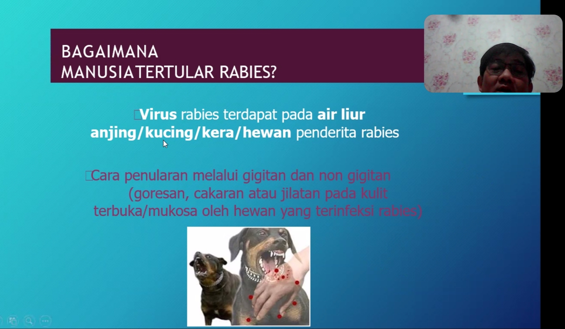 "Virus rabies sendiri bisa menular melalui air liur, gigitan atau cakaran dan jilatan pada kulit yang luka oleh hewan yang terinfeksi rabies, hewan yang berisiko tinggi tinggi untuk menularkan rabies umumnya adalah hewan liar atau hewan peliharaan yang tidak mendapatkan vaksin rabies," kata dr. Novie menambahkan.