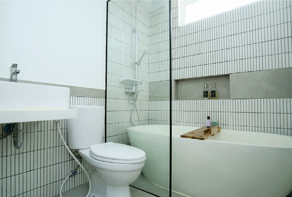 Warna putih mendominasi interior, dipadukan dengan abu-abu dan nuansa kayu. Misalnya, pada kamar mandi.