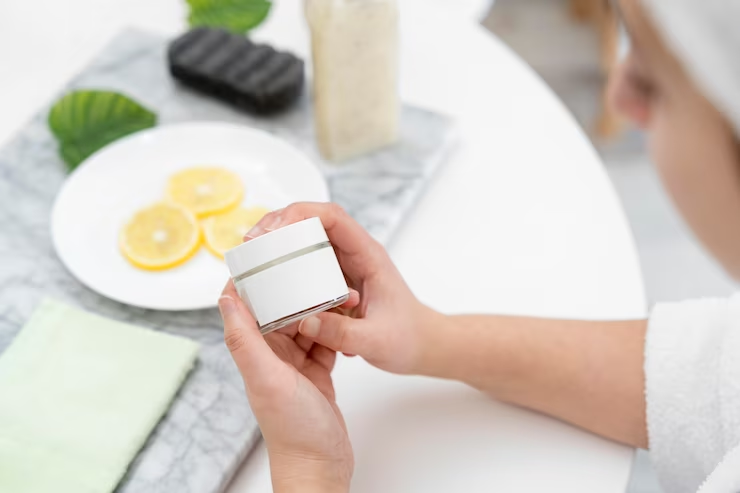 Ilustrasi seorang perempuan sedang memegang produk retinol.