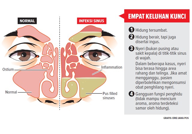SETIAP orang memiliki sinus, rongga kecil di area tulang di wajah dan tengkorak yang terhubung lewat saluran pernapasan. ’’Karena masih terhubung dengan hidung, istilah yang pas adalah rhinosinusitis atau RS. Bukan sinusitis,’’ ungkap dr Budi Laksono SpTHT-KL (K).