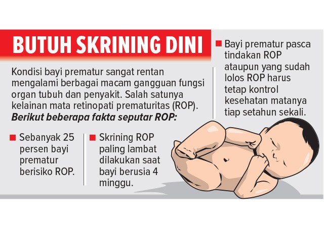 dr Rozalina Loebis SpM (K), dokter spesialis mata di fasilitas kesehatan milik Pemerintah Provinsi Jawa Timur (Jatim) itu, mengatakan bahwa bayi yang lahir kurang dari 31 minggu dan berat badan lahir kurang dari 1.250 gram akan mendapatkan skrining ROP. Tujuannya, mencegah terjadinya keparahan.