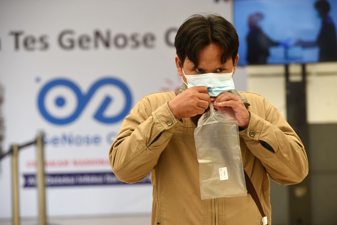 Calon penumpang kereta api mengembuskan nafasnya ke dalam kantong untuk dites COVID-19 dengan GeNose C19 di Stasiun Pasar Senen, Jakarta, Kamis (4/2/2021). PT Kereta Api Indonesia akan menggunakan GeNose C19 untuk tes COVID-19 bagi para calon penumpang ke